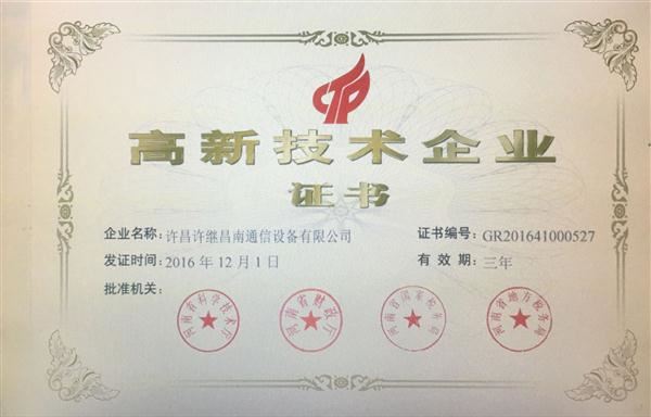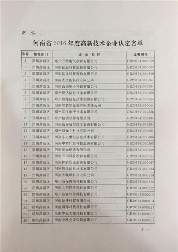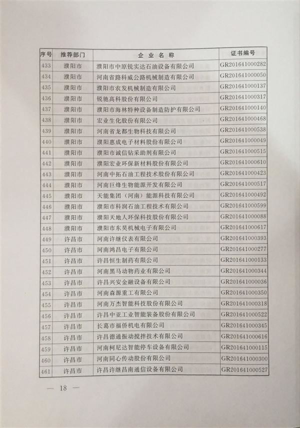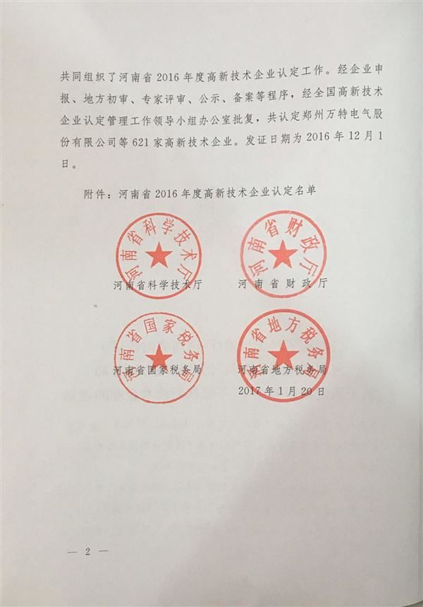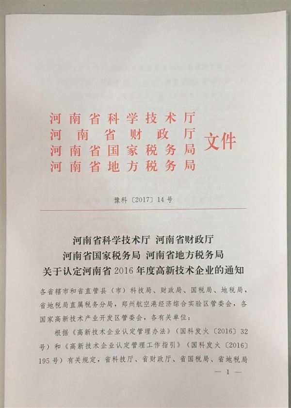 經(jīng)河南省科學(xué)技術(shù)廳、河南省財政廳、河南省國家稅務(wù)局、河南省地方稅務(wù)局組織認(rèn)定,并報全國高新技術(shù)企業(yè)認(rèn)定管理工作領(lǐng)導(dǎo)小組辦公室備案批復(fù),公司于2016年12月被正式認(rèn)定為2016年度國家高新技術(shù)企業(yè)。