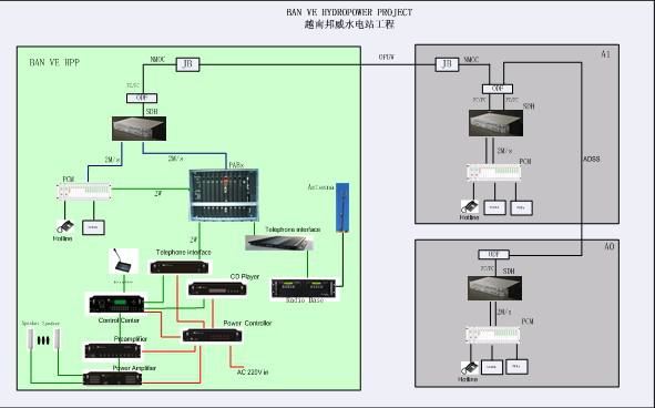 越南邦威水電站項目,單機(jī)容量160MW,總裝機(jī)容量為320MW,由四川東方電力設(shè)備聯(lián)合公司承建,許繼昌南通信公司負(fù)責(zé)全廠通信系統(tǒng)的設(shè)計、供貨、現(xiàn)場安裝調(diào)試工作。通信系統(tǒng)設(shè)備包括:光纖通信系統(tǒng)、調(diào)度程控交換系統(tǒng)、無線對講系統(tǒng)、通信電源系統(tǒng)、公共廣播系統(tǒng)、視頻監(jiān)控系統(tǒng)、泄洪報警系統(tǒng)。